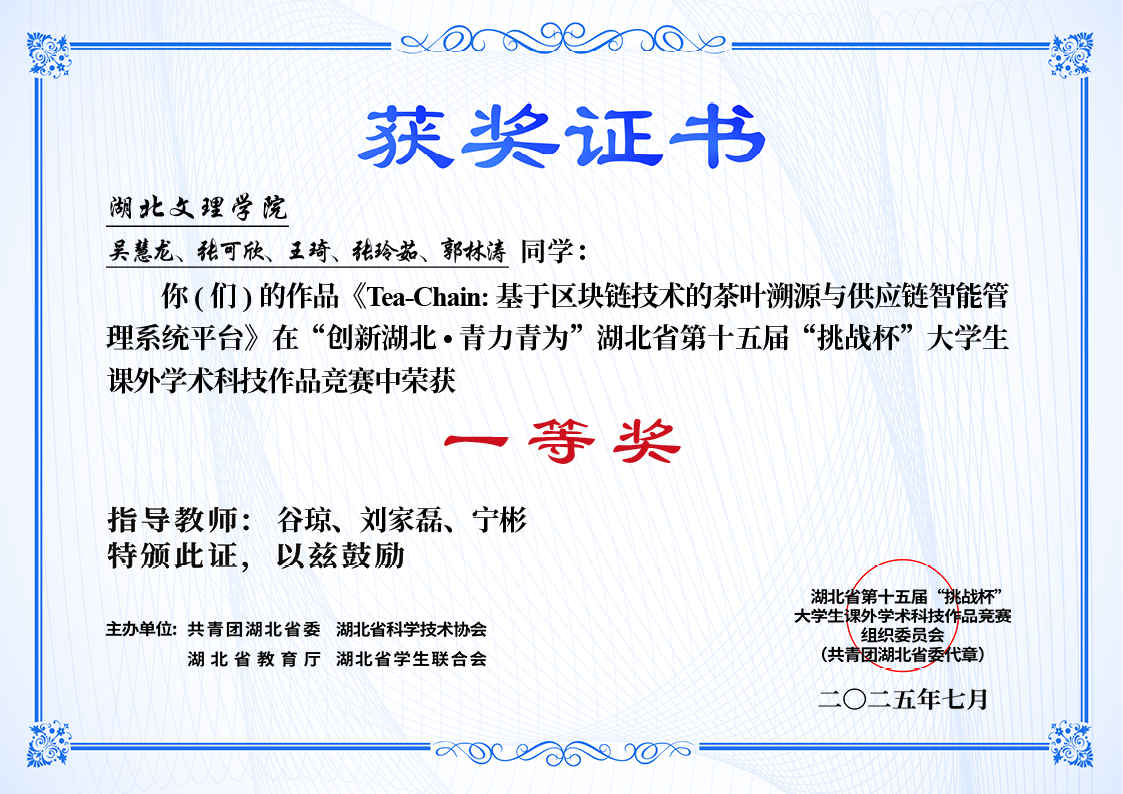 (计算机工程学院 教工通讯员 尚宇航)近日,湖北省第十五届“挑战杯”大学生课外学术科技作品竞赛决赛落下帷幕,我校计算机工程学院项目“Tea-Chain:基于区块链的茶叶溯源与供应链智能管理系统平台”获省级一等奖,该项目在谷琼、刘家磊、宁彬指导下,由吴慧龙,张可欣,王琦,张玲茹,郭林涛五名学生共同完成。